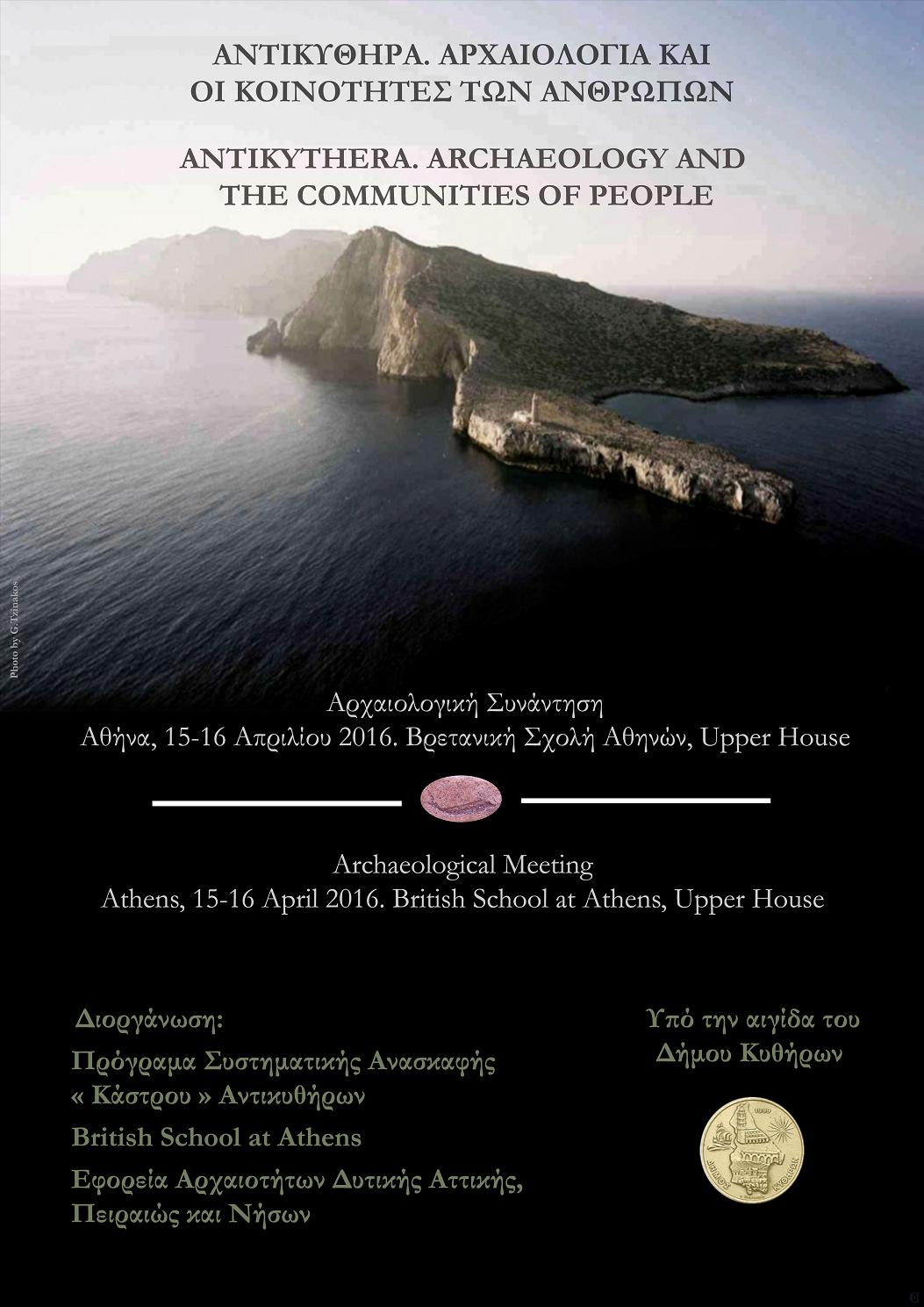 Την Παρασκευή 15 και το Σάββατο 16 Απριλίου 2016 διεξήχθη με επιτυχία στη Βρετανική Σχολή Αθηνών Αρχαιολογική Συνάντηση με θέμα «ΑΝΤΙΚΥΘΗΡΑ, ΑΡΧΑΙΟΛΟΓΙΑ ΚΑΙ ΟΙ ΚΟΙΝΟΤΗΤΕΣ ΤΩΝ ΑΝΘΡΩΠΩΝ» που διοργανώθηκε από το Πρόγραμμα Συστηματικής Ανασκαφής «Κάστρου» Αντικυθήρων με επικεφαλής της οργανωτικής επιτροπής τον κ. Άρη Τσαραβόπουλο, υπό την αιγίδα του Δήμου Κυθήρων.