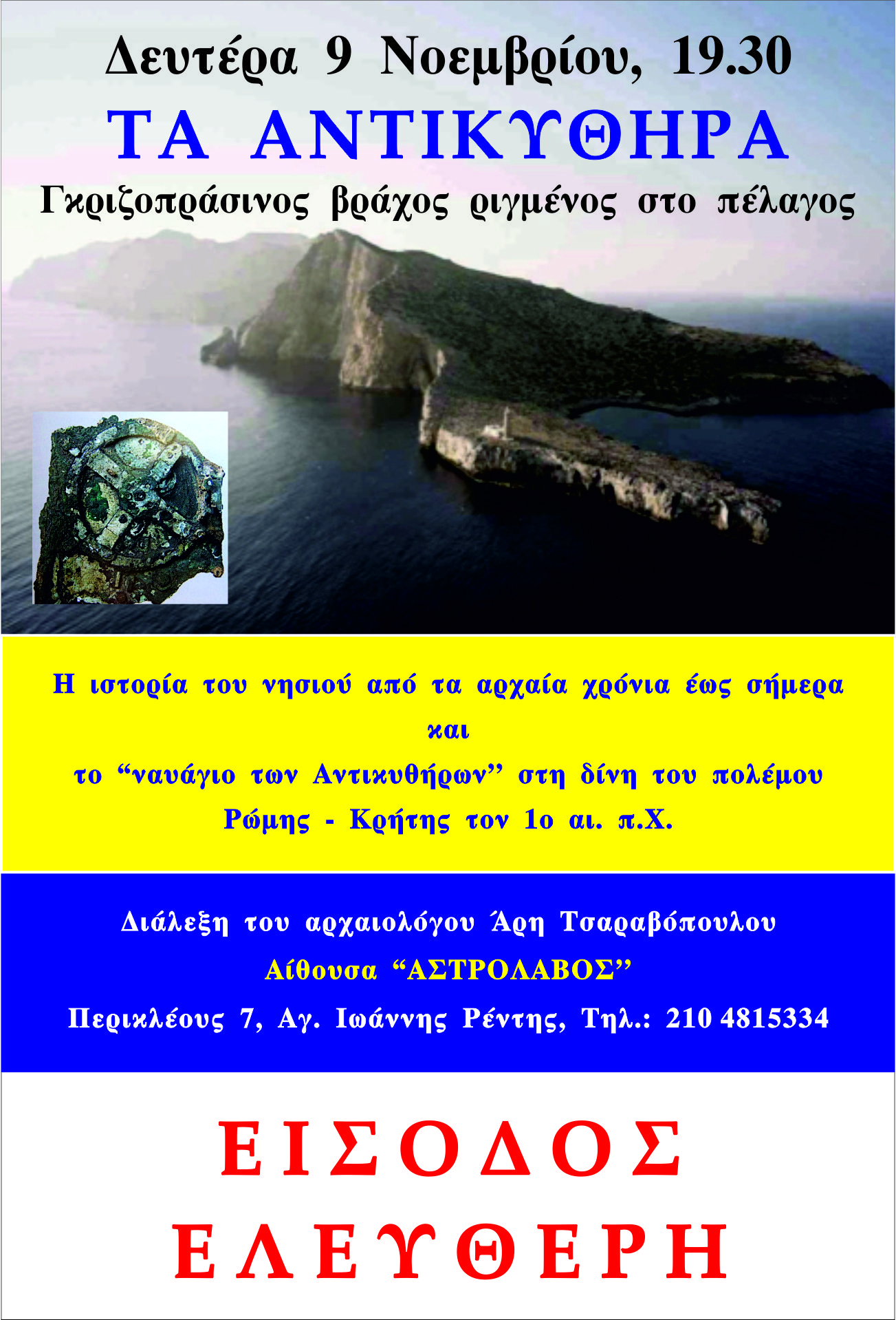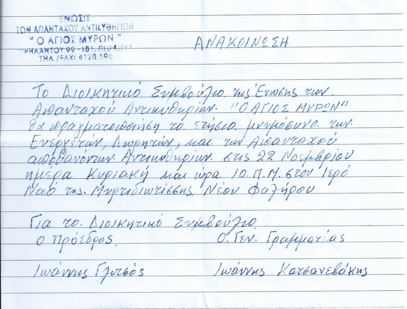 Την Κυριακή 22 Νοεμβρίου, στις 10 π.μ. στον Ιερό Ναό της Παναγίας Μυρτιδιώτισσας, στο Νέο Φάληρο, η Ένωση των Απανταχού Αντικυθηρίων ο "ΑΓΙΟΣ ΜΥΡΩΝ" τέλεσε το ετήσιο μνημόσυνο των ευεργετών, δωρητών και απανταχού Αντικυθηρίων στο οποίο χοροστάτησε ο Σεβασμιώτατος Μητροπολίτης Κυθήρων και Αντικυθήρων κ.Σεραφείμ. Με την λήξη αυτού όλοι οι παρευρισκόμενοι μετέβησαν στο κυλικείο του ιερού ναού όπως κάθε χρόνο για τα καθιερωμένα και ο Σεβασμιώτατος απηύθυνε λόγο , στο τέλος δε διένειμε ημερολόγια της ιεράς Μητροπόλεως. Στο μνημόσυνο παρευρέθηκε ο συμπατριώτης μας Αντιπεριφερειάρχης Νήσων κος Παναγιώτης Χατζηπέρος.