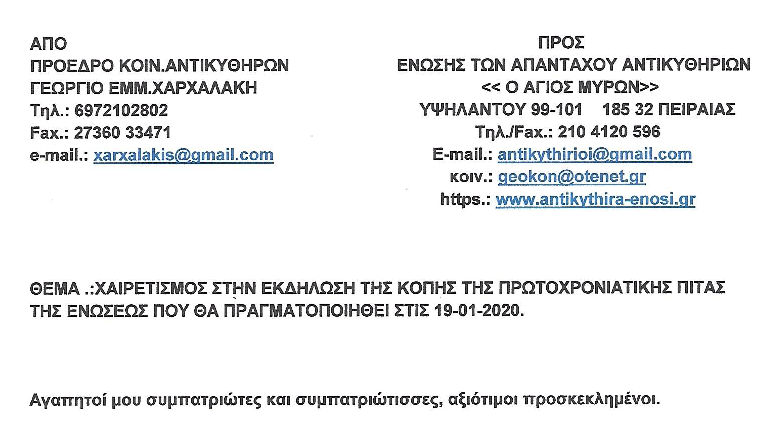 Το Διοικητικό Συμβούλιο της ΕΝΩΣΗΣ ΤΩΝ ΑΠΑΝΤΑΧΟΥ ΑΝΤΙΚΥΘΗΡΙΩΝ «Ο ΑΓΙΟΣ ΜΥΡΩΝ» διοργανώνει την ετήσια χοροεσπερίδα των μελών της Ένωσης την Κυριακή 15 Μαρτίου 2020 και ώρα 13.00 στο κέντρο διασκεδάσεως «ΝΕΑ ΚΟΚΚΙΝΙΩΤΙΣΣΑ Λευτέρης» στην οδό 7ης Μαρτίου 101-103, στη Νίκαια (τηλ. 210 4924004), με καλό φαγητό και ποικίλο μουσικό πρόγραμμα.